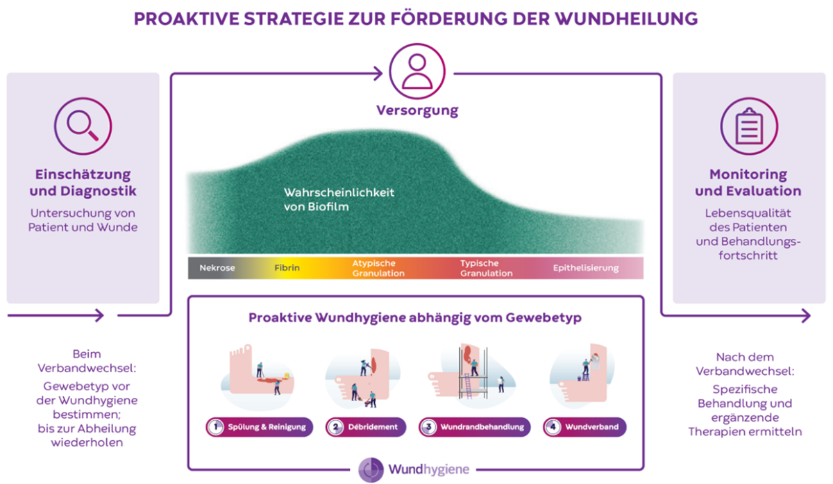 1 Dissemond J, Protz K, Jäger B, Kolbig N, Schimmelpfennig M. Wundhygiene als Teil einer proaktiven Strategie zur Förderung der Wundheilung. WUNDmanagement. 2024; 03.