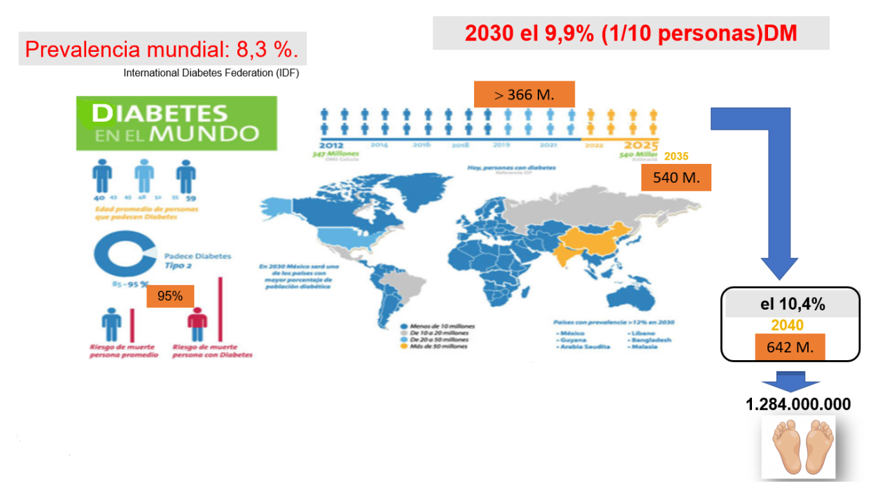 En la actualidad la IDF (International Diabetes Federation) cifra la prevalencia de diabetes en un 8,3%, esperando un aumento de esta a 9,9% en 2030 y de 10,4% en el 2040, lo que supone unos 642 M de pacientes diabéticos y la escalofriante cifra de 1.284.000.000 de pies susceptibles de sufrir lesiones. (1), (2)