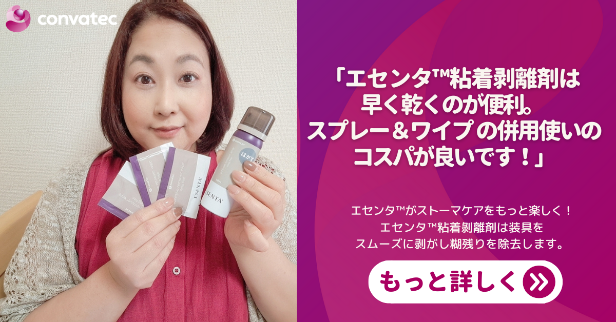 エセンタ™粘着剝離剤はすぐ剥がせるのに、乾きが早い!乾きが早いと、新しい装具もすぐ貼れるので、ストレスがなくてよいです。スプレーの使用感は、シュと吹きかけたら、ジュワーといった感じで、面板と肌の間に浸透していく実感があり、剥がしやすくしてくれます。ワイプはシートのサイズが大きくて使いやすいです。
