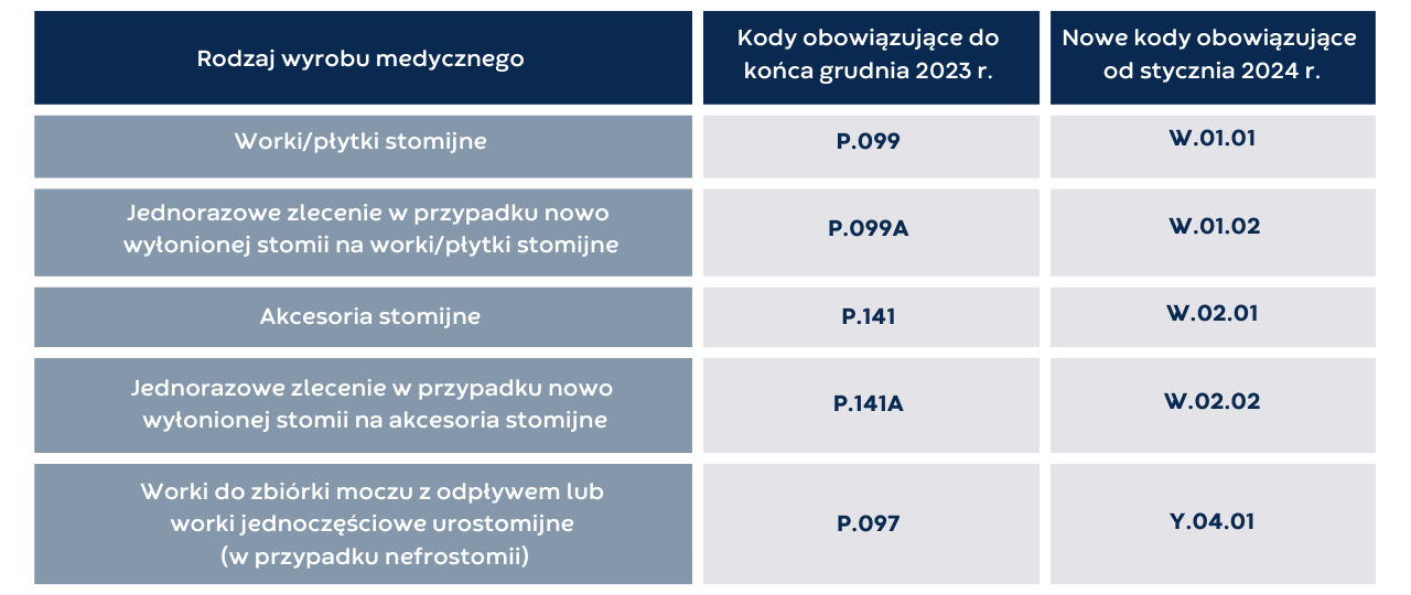 Dotychczasowe kody zaopatrzenia w sprzęt stomijny (P.099; P.099A, P.141; P.141A) zostają zastąpione nowymi. Oznacza to, że osoba uprawniona do wystawienia zlecenia od dnia 1 stycznia 2024 powinna użyć nowych kodów podczas wystawiania zleceń na zaopatrzenie stomijne.